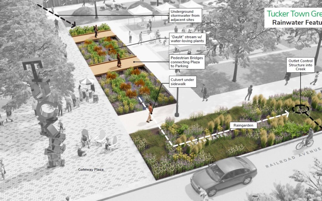 Conceptual rendering of bridges crossing a daylit creek at the Tucker town green.